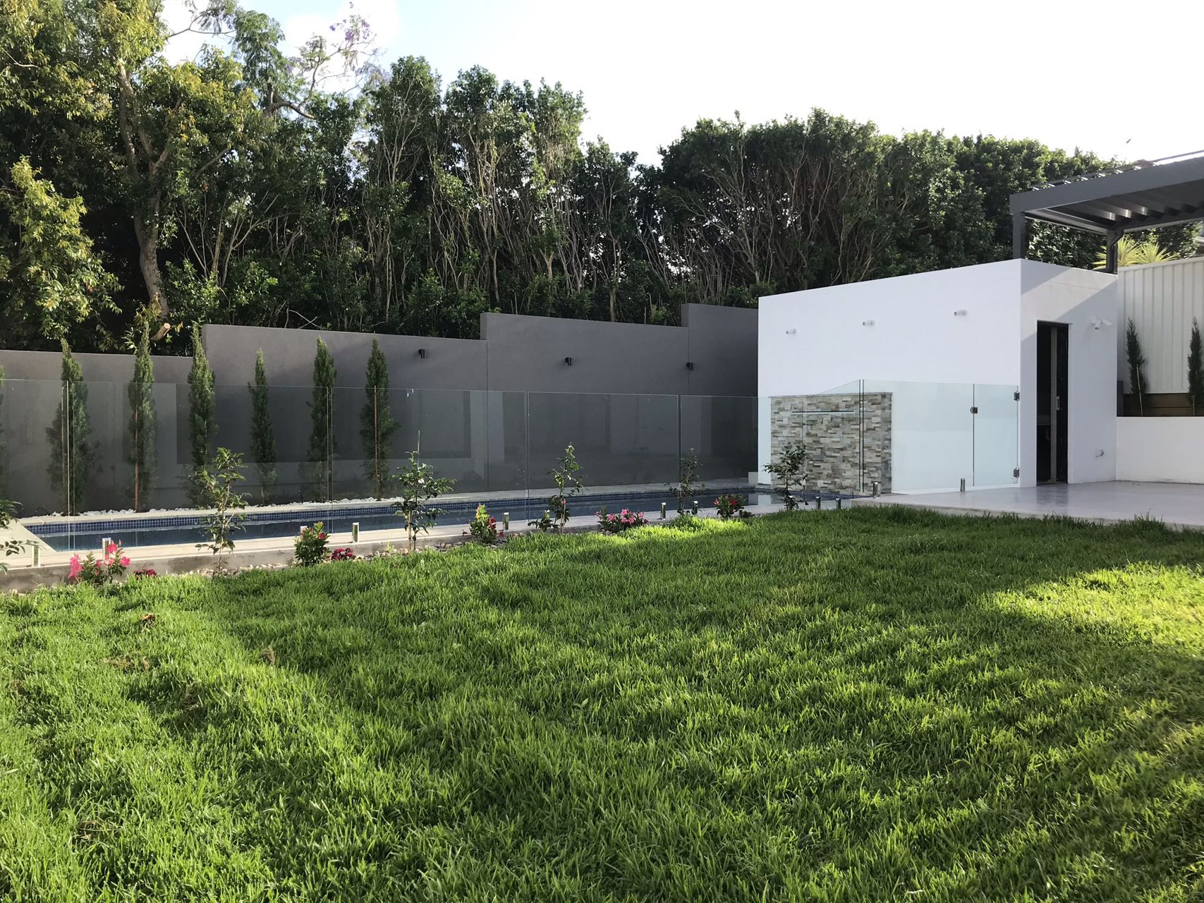 • ground pool with water feature and outdoor bathroom